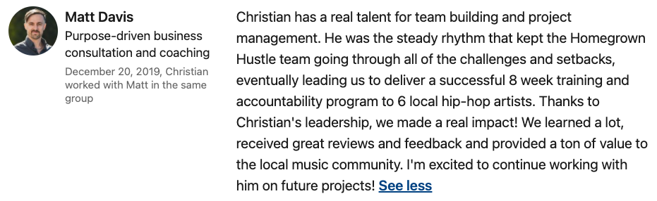 Situation: Homegrown Hustle was a business accelerator formed by Christian and two other associates. Their goal was to create the SF Bay Area’s first community-led music business accelerator program for local musicians.
