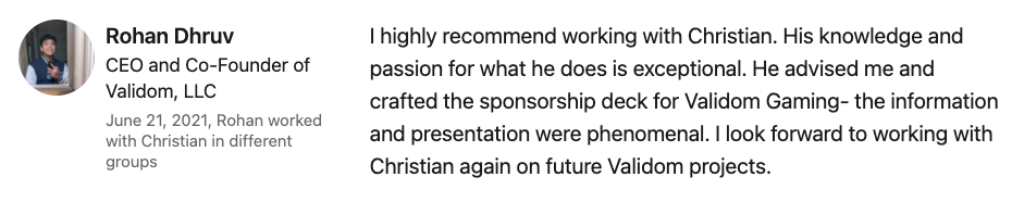 Christian also supported the production of SportIn’s Esports Invitational, a virtual summit held in September 2021, where Christian was also a moderator for the event.