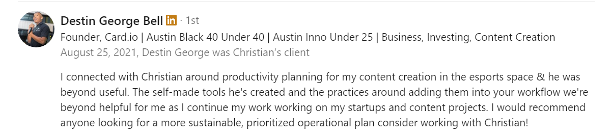 Results: In just over 12 months, the duo produced more than 250 hours of content on project management and other valuable skills via workshops, online group courses, and 1-on-1 training. They supported a community of over 24 individuals who showed personal productivity gains of 200-300% in just 5 weeks and who continue to stay connected to the community for daily accountability calls, weekly learning and coworking hours, monthly socials, and guest speaker events.